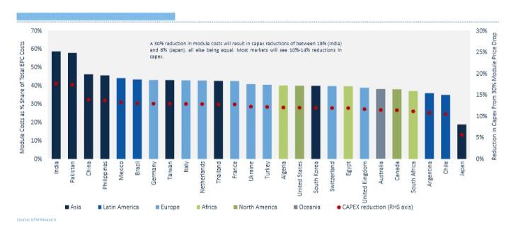 組件價格下降的好處主要體現(xiàn)在亞洲市場,在其他條件相同的情況下,組件成本降低30%將導致大多數(shù)市場的資本支出減少10%-14%。而印度資本支出將減少18%,日本資本支出減少6%,為亞洲最低。