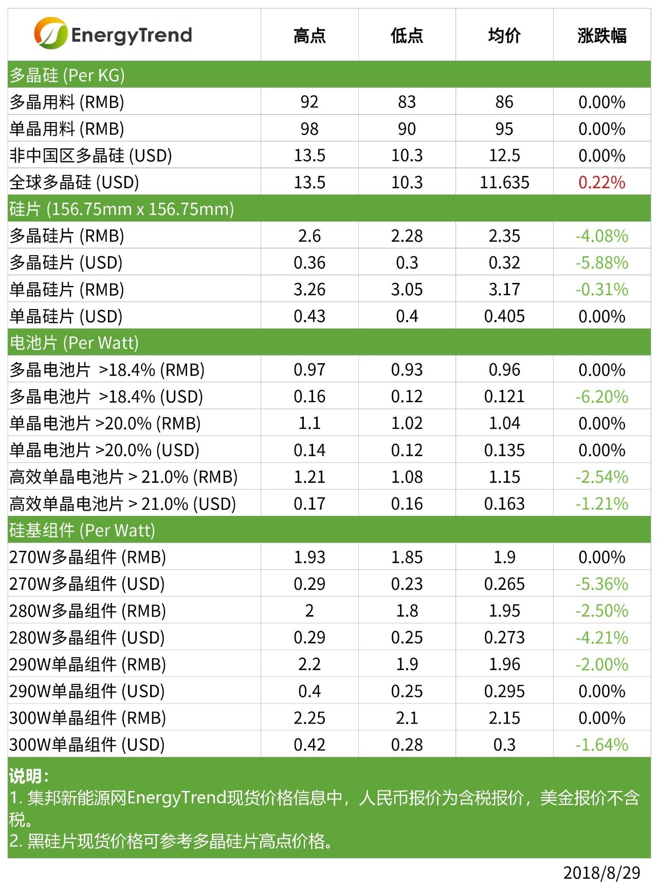 單晶PERC電池持續(xù)降價,目前大陸國內(nèi)一般單晶價格在RMB1.02~1.10/W,高效單晶則是落在RMB1.08~1.21/W。多晶常規(guī)電池價格為RMB0.93~0.97/W。海外的常規(guī)單晶價格在US$0.124~0.140/W,高效單晶的價格則下調(diào)至US$0.161~0.165/W、均價降至US$0.163/W。多晶電池價格維持在US$0.118~0.155/W,但均價降至US$0.121/W。