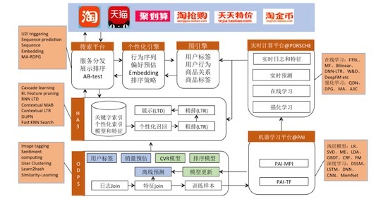 c. 流式計算和在線學(xué)習(xí)平臺 Porsche,流式計算是基于blink負(fù)責(zé)實時日志解析和特征join生成實時排序特征,在線學(xué)習(xí)和離線學(xué)習(xí)底層框架可以相同,差別主要是依賴數(shù)據(jù)源和部分優(yōu)化方法不同,由于用戶行為和市場環(huán)境變化快,流式計算和在線學(xué)習(xí)在搜索應(yīng)用非常廣泛,并積累了不少在線學(xué)習(xí)和強(qiáng)化學(xué)習(xí)算法;