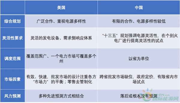 通過(guò)借鑒美國(guó)的成功經(jīng)驗(yàn),我們發(fā)現(xiàn)協(xié)調(diào)綜合規(guī)劃、重視電力系統(tǒng)靈活性、完善的電力市場(chǎng)和審慎的市場(chǎng)設(shè)計(jì)、擴(kuò)大調(diào)度范圍、改善風(fēng)力預(yù)測(cè)是普及可再生能源的關(guān)鍵因素。以下表格總結(jié)了中國(guó)和美國(guó)的電力領(lǐng)域的五個(gè)特點(diǎn)。