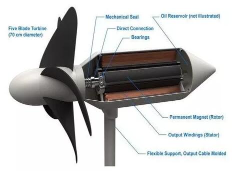 渦輪機(jī)本身設(shè)計(jì)成能承受極端海浪和惡劣天氣(比如臺(tái)風(fēng)),就像一朵花,直徑為70公分的5條旋轉(zhuǎn)葉片由柔軟材料制成,旋轉(zhuǎn)速度慢到足夠讓不小心被葉片掃過的海洋生物逃脫不受傷,支架結(jié)構(gòu)也靈活彎曲,以避免它們?cè)诖罄酥?ldquo;剛極必折”。研究團(tuán)隊(duì)估計(jì),渦輪機(jī)的使用壽命長達(dá)10年。
