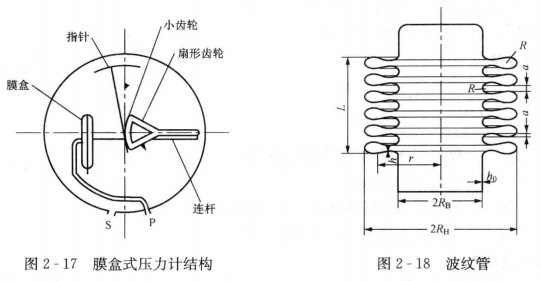 (3)膜盒式壓力計。膜盒式壓力計的感壓元件通常是用兩塊金屬波紋膜片焊接而成。與膜片式壓力計相比,由于中心位移量增加了,因此靈敏度也相應提高了。圖2-17所示為膜盒式壓力計結構。