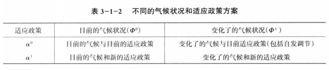 表3-1-2中,適應(yīng)政策a0并不是指對(duì)氣候變化和易變性不作出反應(yīng)或者照搬日前的做法。它僅被看作為一個(gè)方案,在此方案中,假設(shè)對(duì)氣候變化的社會(huì)影響起主要作用的是公共設(shè)施,假設(shè)是在最初狀態(tài)下這些因素保持不變。政策方案a0包括現(xiàn)有水資源的存儲(chǔ)量和輸送設(shè)施、現(xiàn)有關(guān)于水資源的使用權(quán)、現(xiàn)有關(guān)于種植品種的用水規(guī)定、現(xiàn)有計(jì)劃培育的種植品種、現(xiàn)有減災(zāi)的政策等。在此情況下,私人機(jī)構(gòu)可自由作出許多自發(fā)調(diào)節(jié),該調(diào)節(jié)會(huì)潛在地影響氣候變化的結(jié)果。例如,可能澆灌更多的土地,種植不同的作物,改變種植品種等。企業(yè)在商品生產(chǎn)過(guò)程中自行調(diào)整其投入計(jì)劃,家庭根據(jù)相關(guān)價(jià)格的變化自由地選購(gòu)商品,等等。