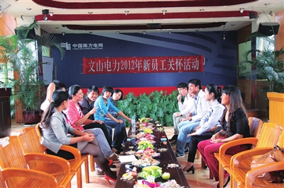 文山電力團委節(jié)前關(guān)愛新員工?!×螡?攝冗員與結(jié)構(gòu)性缺員并存,成為困擾企業(yè)發(fā)展的老大難問題。近年來,云南文山電力股份有限公司(以下簡稱文山電力)不斷破冰,通過整合資源,釋放生產(chǎn)人員到一線班組、機關(guān)人員