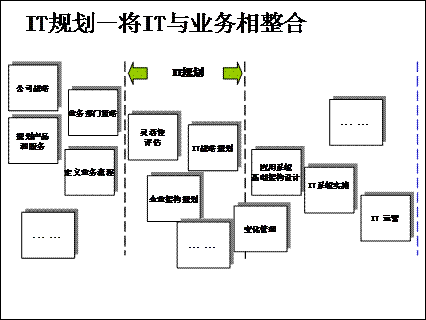 如上圖所示,IT規(guī)劃是要在企業(yè)確定了業(yè)務的發(fā)展戰(zhàn)略和業(yè)務流程后,根據(jù)業(yè)務發(fā)展的需要,規(guī)劃IT未來的發(fā)展戰(zhàn)略和總體架構,并提出未來IT實施的主要戰(zhàn)略性行動和總體計劃。