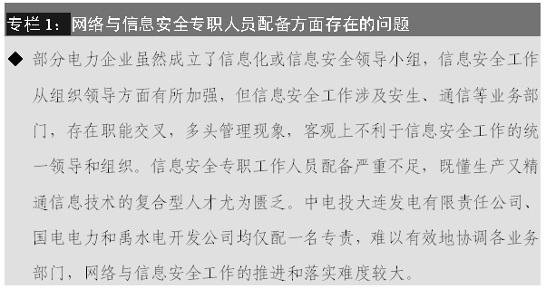 1. 部分電力企業(yè)網(wǎng)絡與信息安全工作多頭管理,職能交叉,缺乏統(tǒng)一領導和溝通協(xié)調(diào);信息安全工作人員配備不足,甚至身兼數(shù)職,不利于信息安全工作的落實。