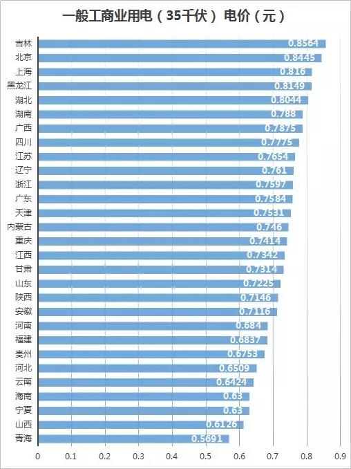 2018年,我國一般工商業(yè)電價(jià)的排行之中一直是吉林最高,吉林一般工商業(yè)用電價(jià)格為0.8864元比第二位的北京多出0.011元,比全國加總的平均電價(jià)0.76元要高出0.1264元。