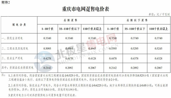 電價(jià)調(diào)整詳見重慶市電網(wǎng)銷售電價(jià)表(附表1)、重慶市電網(wǎng)躉售電價(jià)表(附表2)。重慶市電網(wǎng)銷售電價(jià)表執(zhí)行范圍為國網(wǎng)重慶市電力公司供電區(qū)域,三峽水利電力(集團(tuán))股份有限公司同步執(zhí)行國網(wǎng)重慶市電力公司銷售電價(jià)。