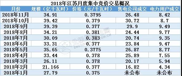 由于江蘇省月度集中競(jìng)價(jià)交易不設(shè)交易電量上限,所以條件相對(duì)寬松,從2018年整體交易形勢(shì)來(lái)看,月度競(jìng)價(jià)保持在相對(duì)穩(wěn)定程度。今年1-11月,江蘇的月度集中競(jìng)價(jià)共成交355.486億千瓦時(shí),成交價(jià)格在0.37-0.38元/千瓦時(shí)之間波動(dòng),平均成交價(jià)格為0.378元/千瓦時(shí)。值得注意的是2017年7月,江蘇省把上網(wǎng)電價(jià)0.378元/千瓦時(shí)上調(diào)至0.391元/千瓦時(shí),升幅0.013元/千瓦時(shí)。然而,隨后月競(jìng)價(jià)差似乎也沒(méi)多大波動(dòng),市場(chǎng)價(jià)格似乎也難以得到突破。這也使得江蘇的月競(jìng)較其他省份來(lái)說(shuō),少了價(jià)差方面的大起大落,報(bào)價(jià)反而更加趨于理性。