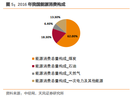 傳統(tǒng)能源消費(fèi)比重下降,清潔能源需求穩(wěn)步增加。我國(guó)能源的消費(fèi)需求正更多依賴(lài)可再生能源、天然氣和電力,煤炭和石油需求則有所回落。截至2016年,我國(guó)能源消費(fèi)構(gòu)成中,