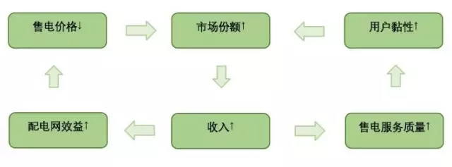 配售一體化的商業(yè)模式我們或許可以從京東模式來進行推演。售電公司可以選擇投資增量配電網(wǎng)得到過網(wǎng)費收益,根據(jù)電改要求電網(wǎng)可以收取過網(wǎng)費,在收回成本的同時還可以獲得合理的收益。配電網(wǎng)的收益可以保證售電公司在售電側(cè)有更大的承受能力來降低售電價格,并借此在競爭中獲取更多的用戶,提高公司的整體收入水平。收入的增長一方面可以用于優(yōu)化配電網(wǎng)的網(wǎng)絡(luò)結(jié)構(gòu)、提高自動化程度、提升運維管理和資產(chǎn)管理水平等方面來提高配電網(wǎng)利用效率并進一步增加配電網(wǎng)的效益,另一方面可以用于提升售電公司的個性化綜合服務(wù)水平來增加用戶黏性并進一步獲取更多的市場份額。如此便可以形成一個良性的閉環(huán)。