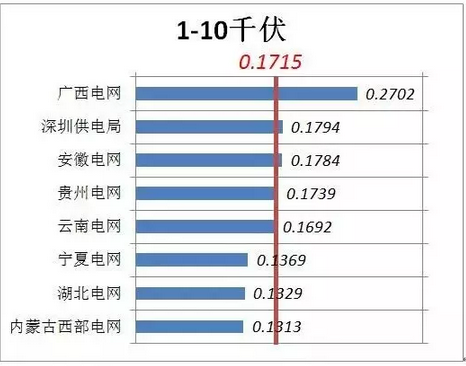 (2)1-10千伏:8省市平均為0.1715元/千瓦時(shí),其中,廣西最高為0.2702元/千瓦時(shí),內(nèi)蒙古西部電網(wǎng)最低為0.1313元/千瓦時(shí)。詳情如下: