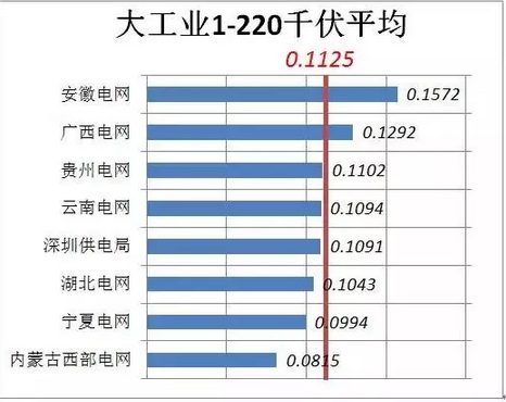 (1)、1-220千伏算術(shù)平均:8省市平均為0.1125元/千瓦時(shí),其中,安徽最高為0.1572元/千瓦時(shí),內(nèi)蒙古西部電網(wǎng)最低為0.0815元/千瓦時(shí)。詳情如下: