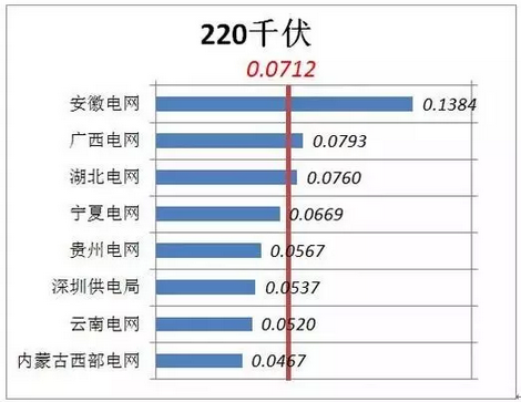 (5)220千伏:8省市平均為0.712元/千瓦時(shí),其中,安徽最高為0.1384元/千瓦時(shí),內(nèi)蒙古西部電網(wǎng)最低為0.0467元/千瓦時(shí)。詳情如下: