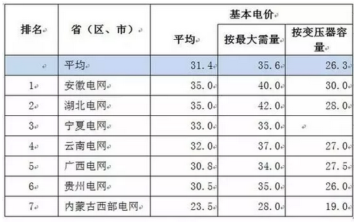 基本電價(jià)只有大工業(yè)用戶收取,分按最大需量和按變壓器容量收取,深圳供電局輸配電價(jià)未包含基本電價(jià),寧夏電網(wǎng)未包含按變壓器容量收取的價(jià)格,從7省市的基本電價(jià)情況來看,平均為31.4元/千瓦˙月,按最大需量平均為35.6元/千瓦˙月,按變壓器容量平均為26.3元/千瓦˙月,安徽最高,內(nèi)蒙古西部電網(wǎng)最低,詳情如下: