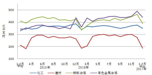 1-2月份,化學原料制品、非金屬礦物制品、黑色金屬冶煉和有色金屬冶煉四大高載能行業(yè)用電量合計2730億千瓦時,同比增長11.8%,增速比上年同期提高21.8個百分點;合計用電量占全社會用電量的比重為29.2%,對全社會用電量增長的貢獻率為51.6%。其中,化工行業(yè)用電量699億千瓦時,同比增長2.8%,增速比上年同期回落0.5個百分點;建材行業(yè)用電量375億千瓦時,同比增長0.5%,增速比上年同期提高12.5個百分點;黑色金屬冶煉行業(yè)用電量776億千瓦時,同比增長15.7%,增速比上年同期提高33.7個百分點;有色金屬冶煉行業(yè)880億千瓦時,同比增長22.4%,增速比上年同期提高34.2個百分點。