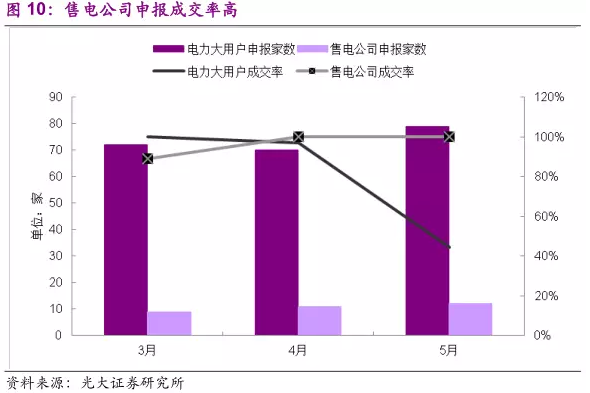 售電企業(yè)在參與競爭性報(bào)價(jià)前,與被代理用戶首先簽訂了協(xié)議,明確了降價(jià)額度。我們認(rèn)為集中競價(jià)交易中用戶成交的最低報(bào)價(jià)可代表用戶降價(jià)預(yù)期的上限,按照5月份交易數(shù)據(jù)來看,用戶降價(jià)預(yù)期的上限在0.03元/kWh左右。實(shí)際上大部分用戶對(duì)降價(jià)幅度的預(yù)期是參照的以往的大客戶直購電的情況,通常在0.01元/kWh左右,從行業(yè)層面了解的情況來看,用戶與售電公司簽訂的長期代理協(xié)議中要求的降價(jià)幅度為0.01元/kWh左右。3-5月份平均結(jié)算降價(jià)幅度均在0.13元/kWh以上,也就是說售電公司每度電的利潤在0.1元以上,在電力交易市場放開初期獲得暴利。
