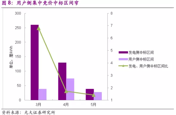 與發(fā)電側(cè)相比,用戶側(cè)報(bào)價(jià)中標(biāo)區(qū)間更窄。發(fā)電側(cè)三月份的中標(biāo)區(qū)間(中標(biāo)的最高報(bào)價(jià)-最低報(bào)價(jià))高達(dá)260厘/kWh,顯著高于用戶側(cè)中標(biāo)區(qū)間,此后發(fā)電、用戶側(cè)中標(biāo)區(qū)間比逐步縮窄,但到五月仍高達(dá)1.4。中標(biāo)區(qū)間的大小反映出對(duì)申報(bào)價(jià)格精準(zhǔn)度的要求,由此看來用戶側(cè)對(duì)申報(bào)價(jià)格的精準(zhǔn)度要求要顯著高于發(fā)電側(cè)。