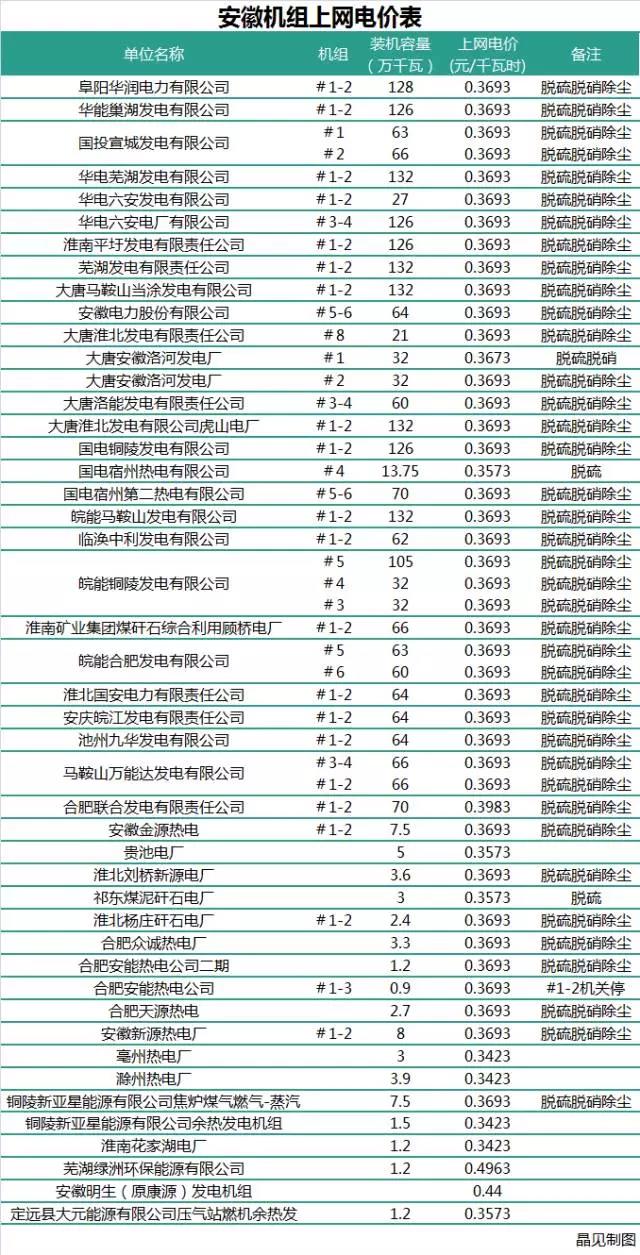 這么一來,我們把注意力放到了統(tǒng)一出清價上。我們整理了安徽物價局在2016年6月8日發(fā)布的《關(guān)于調(diào)整電價有關(guān)問題的通知》中的發(fā)電企業(yè)上網(wǎng)電價。本次交易的出清價0.3722元/千瓦時,基本比下面物價局核定的上網(wǎng)電價要高。這么一來,為什么這次成交電量這么少就解釋的通了。這次安徽的電力集中交易是在反向降價么?