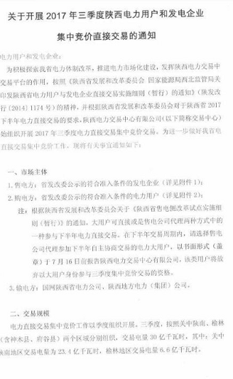 陜西電力交易中心日前發(fā)布了《關于開展2017年三季度陜西電力用戶和發(fā)電企業(yè)集中競價直接交易的通知》,此次交易電量30億千瓦時,分兩個區(qū)域組織交易,其中關中陜南區(qū)域交易電量23 4億千瓦時,榆林地區(qū)交易電量6