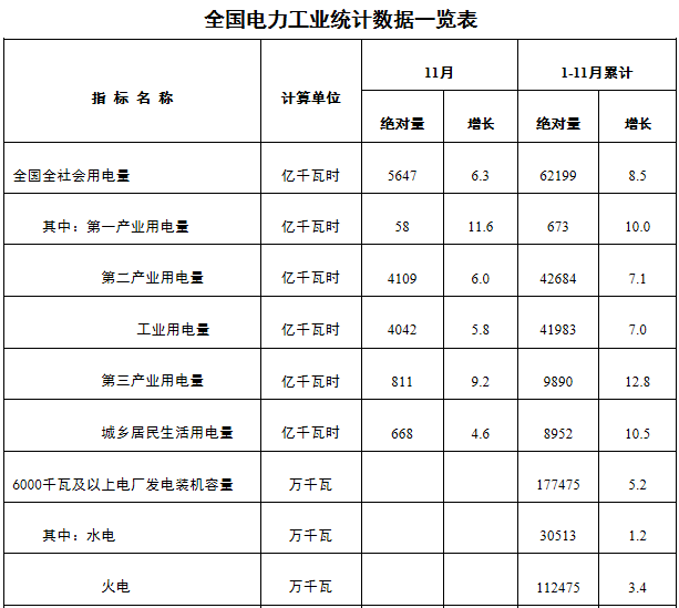 12月20日,國家能源局發(fā)布1-11月份全國電力工業(yè)統(tǒng)計數(shù)據(jù)。