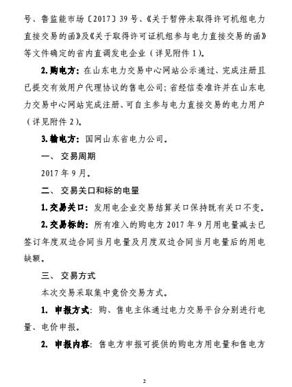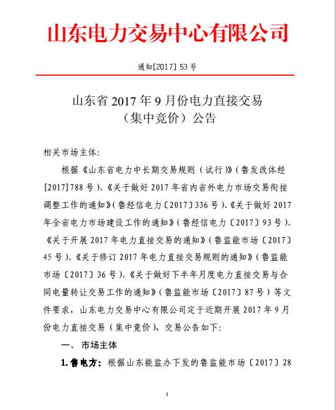 山東發(fā)布9月份電力直接交易(集中競(jìng)價(jià))公告
