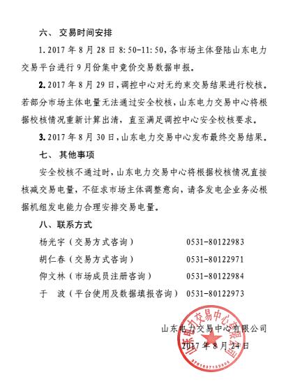 從山東電力交易中心獲悉,山東電力交易中心2日發(fā)布了關(guān)于2017年9月份電力直接交易(集中競(jìng)價(jià))公告。交易采取集中競(jìng)價(jià)交易方式,2017年8月28日8:50-11:50,各市場(chǎng)主體登錄山東電力交易平臺(tái)進(jìn)行9月份集中競(jìng)價(jià)交易數(shù)據(jù)申報(bào)。