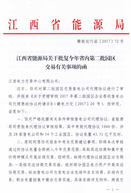 江西省能源局日前批復(fù)了《關(guān)于今年省內(nèi)第二批園區(qū)交易有關(guān)事項的函》。