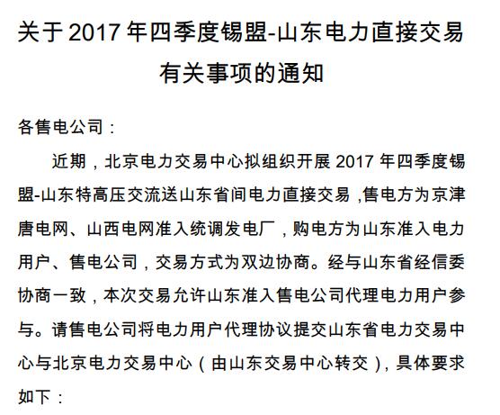 關(guān)于2017年四季度錫盟-山東電力直接交易有關(guān)事項的通知