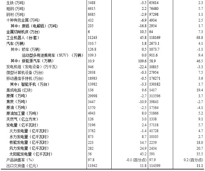 分產品看,11月份,596種產品中有318種產品同比增長。其中,鋼材8685萬噸,同比下降2.9%;水泥22051萬噸,增長4.8%;十種有色金屬432萬噸,下降6.9%;乙烯155萬噸,增長6.7%;汽車310.7萬輛,增長1.8%;轎車126.8萬輛,增長0.5%;發(fā)電量5196億千瓦時,增長2.4%;原油加工量4943萬噸,增長8.0%。