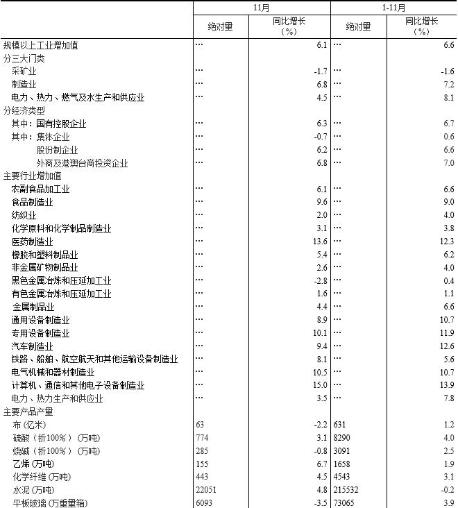分行業(yè)看,11月份,41個大類行業(yè)中有35個行業(yè)增加值保持同比增長。其中,農副食品加工業(yè)增長6.1%,紡織業(yè)增長2.0%,化學原料和化學制品制造業(yè)增長3.1%,非金屬礦物制品業(yè)增長2.6%,黑色金屬冶煉和壓延加工業(yè)下降2.8%,有色金屬冶煉和壓延加工業(yè)增長1.6%,通用設備制造業(yè)增長8.9%,專用設備制造業(yè)增長10.1%,汽車制造業(yè)增長9.4%,鐵路、船舶、航空航天和其他運輸設備制造業(yè)增長8.1%,電氣機械和器材制造業(yè)增長10.5%,計算機、通信和其他電子設備制造業(yè)增長15.0%,電力、熱力生產和供應業(yè)增長3.5%。