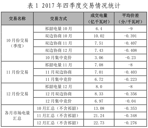 表 1 2017 年四季度交易情況統(tǒng)計