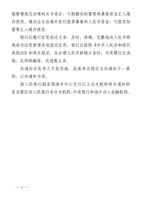 《通知》堅(jiān)持人民幣跨境業(yè)務(wù)“服務(wù)實(shí)體經(jīng)濟(jì)、促進(jìn)貿(mào)易投資便利化”的導(dǎo)向,進(jìn)一步完善和優(yōu)化人民幣跨境業(yè)務(wù)政策,滿足市場(chǎng)合理需求。主要內(nèi)容:一是明確凡依法可使用外匯結(jié)算的跨境交易,企業(yè)都可以使用人民幣結(jié)算。支持銀行以服務(wù)實(shí)體經(jīng)濟(jì)、促進(jìn)貿(mào)易投資便利化為導(dǎo)向,按照現(xiàn)有人民幣跨境業(yè)務(wù)政策創(chuàng)新金融產(chǎn)品,提升金融服務(wù)能力,滿足市場(chǎng)主體真實(shí)、合規(guī)的人民幣跨境業(yè)務(wù)需求。二是為服務(wù)“一帶一路”建設(shè),滿足個(gè)人項(xiàng)下雇員報(bào)酬、社會(huì)福利、贍家款等人民幣跨境結(jié)算需要,《通知》明確銀行可在“展業(yè)三原則”的基礎(chǔ)上,為個(gè)人辦理其他經(jīng)常項(xiàng)目人民幣跨境收付業(yè)務(wù),便利境內(nèi)個(gè)人將境外合法收入?yún)R回境內(nèi)使用,以及境外個(gè)人將境內(nèi)合法人民幣收入?yún)R出境外。三是踐行綠色發(fā)展理念,明確了境外投資者辦理碳排放權(quán)交易人民幣跨境結(jié)算業(yè)務(wù)的相關(guān)規(guī)定,支持境外投資者以人民幣參與境內(nèi)碳排放權(quán)交易。四是便利境外投資者以人民幣進(jìn)行直接投資。《通知》進(jìn)一步優(yōu)化了業(yè)務(wù)辦理流程,取消了相關(guān)賬戶開(kāi)立和資金使用等有關(guān)方面的限制,明確銀行可在“展業(yè)三原則”的基礎(chǔ)上,根據(jù)企業(yè)實(shí)際需要辦理相關(guān)業(yè)務(wù)?!锻ㄖ芬筱y行應(yīng)確保境外投資者的人民幣利潤(rùn)、股息等投資收益依法自由匯出。五是明確了境內(nèi)企業(yè)境外發(fā)行債券、股票募集的人民幣資金可按實(shí)際需要調(diào)回境內(nèi)使用,進(jìn)一步簡(jiǎn)化管理流程,便利企業(yè)日常運(yùn)營(yíng)。