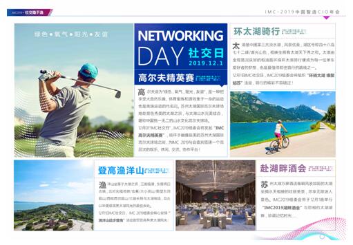在12月1日“IMC社交日”,IMC組委會將精心組織高爾夫精英賽、環(huán)太湖騎行活動、漁陽山徒步登高活動等戶外休閑運動,豐富嘉賓們的會議行程體驗。晚間,組委會還將在萬豪酒店舉行湖畔酒會,嘉賓們在太湖湖畔的迷人夜色中結束一天的社交。