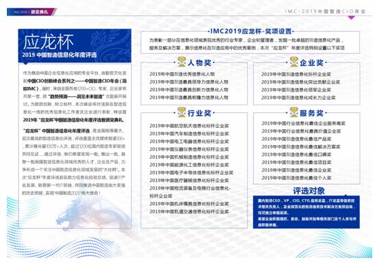 作為一項國內頂級規(guī)模、頂尖層次的智造信息化評選,2019“應龍杯”中國智造信息化年度評選將覆蓋100+主流媒體報道,1200+智造專家共同見證。獎項設置分為“人物獎”“企業(yè)獎”“行業(yè)獎”“服務獎”四大類。通過評選,我們希望發(fā)掘、凝聚一批我國智造信息化領域優(yōu)秀的人才、企業(yè)及產品,力爭形成一個關注和致力于中國智造信息化領域發(fā)展的“大社群”!