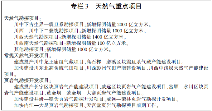加快推動(dòng)川中、川西和川東北常規(guī)天然氣勘探開發(fā),川南頁巖氣資源調(diào)查和勘探開發(fā)。到2020年,新增常規(guī)天然氣探明儲(chǔ)量6500億立方米,天然氣產(chǎn)量達(dá)到450億立方米(其中頁巖氣100億立方米)。