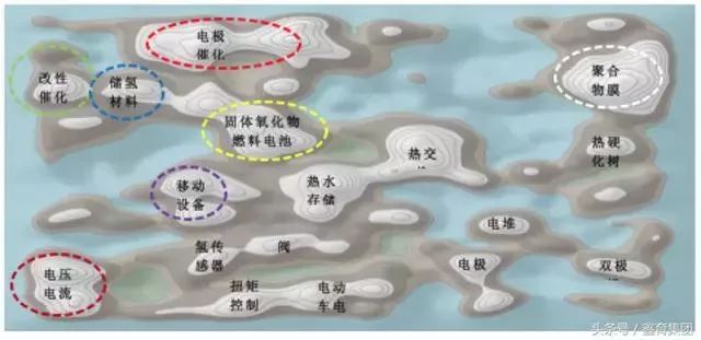使用湯森路透公司Thomson Innovation,將專利數(shù)據(jù)通過(guò)文本聚類,繪制產(chǎn)業(yè)技術(shù)研發(fā)重點(diǎn)的專利地形圖。山峰表示專利技術(shù)的集中區(qū),山峰顏色越淺,專利越密集。圖中顯示,國(guó)際燃料電池技術(shù)研究重點(diǎn)包括,聚合物膜、固體氧化物燃料電池、電極催化層、改性催化劑、儲(chǔ)氫材料、電壓電流控制、移動(dòng)設(shè)備應(yīng)用等技術(shù)。