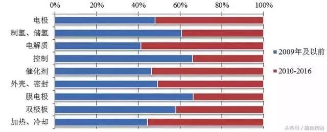 圖中可以看出,電解質(zhì)、外殼和密封、催化劑、膜電極組件等技術(shù)在最近幾年的發(fā)展速度超過(guò)平均發(fā)展速度。顯示這些技術(shù)為近期燃料電池領(lǐng)域技術(shù)研發(fā)熱點(diǎn),得到研發(fā)機(jī)構(gòu)的追捧。