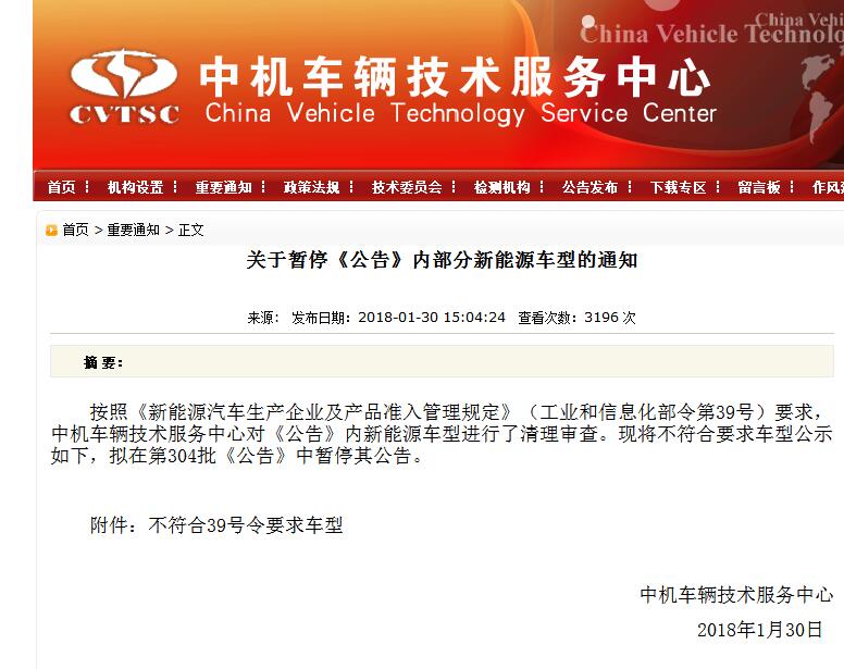 1月30日,中機(jī)中心網(wǎng)站發(fā)布關(guān)于暫停《公告》內(nèi)部分新能源車型的通知。通知指出,按照《新能源汽車生產(chǎn)企業(yè)及產(chǎn)品準(zhǔn)入管理規(guī)定》(工業(yè)和信息化部令第39號)要求,中機(jī)車輛技術(shù)服務(wù)中心對《公告》內(nèi)新能源車型進(jìn)行了清理審查?,F(xiàn)將不符合要求車型公示如下,擬在第304批《公告》中暫停其公告。