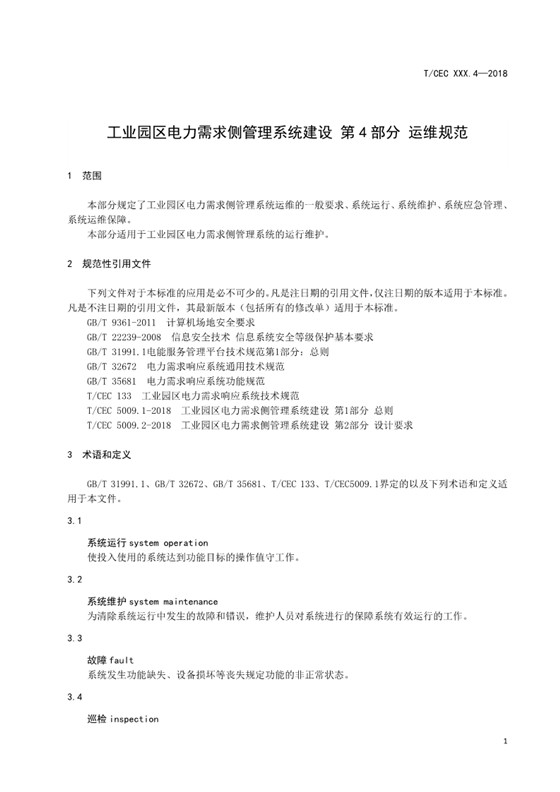 《工業(yè)園區(qū)電力需求側(cè)管理系統(tǒng)建設(shè) 第3部分:實(shí)施和驗(yàn)收規(guī)范》(計(jì)劃編號(hào)T CEC 20181071)、《工業(yè)園區(qū)電力需求側(cè)管理系統(tǒng)建設(shè) 第4部分:運(yùn)維規(guī)范》(計(jì)劃編號(hào)T CEC 20181072)、工業(yè)園區(qū)電力需求側(cè)管理系統(tǒng)建設(shè) 第5部分:評(píng)價(jià)規(guī)范》(計(jì)劃編號(hào)T CEC 20181073)已完成征求意見稿,現(xiàn)征求意見。