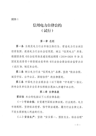 為規(guī)范電力行業(yè)市場主體行為,營造電力行業(yè)誠信經營氛圍,提高電力行業(yè)社會信用度,中國電力企業(yè)聯(lián)合會(簡稱“中電聯(lián)”)發(fā)起《信用電力自律公約(試行)》(簡稱“自律公約”,附件1)?,F(xiàn)印發(fā)給你們。