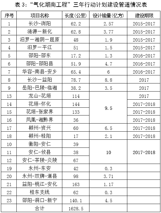 表3:“氣化湖南工程”三年行動計劃建設(shè)管道情況表