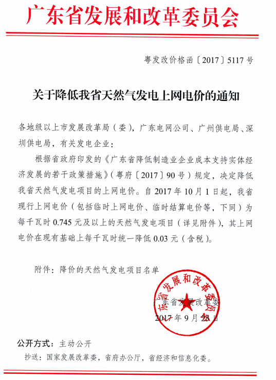 近日廣東發(fā)改委發(fā)布降低天然氣發(fā)電上網(wǎng)電價(jià)的通知,自2017年10月1日起,廣東省現(xiàn)行天然氣上網(wǎng)電價(jià)(包括臨時(shí)上網(wǎng)電價(jià)、臨時(shí)結(jié)算電價(jià)等,下同)為每千瓦時(shí)0.745元及以上的天然氣發(fā)電項(xiàng)目,其上網(wǎng)電價(jià)在現(xiàn)有基礎(chǔ)上每千瓦時(shí)統(tǒng)一降低0.03元(含稅)。