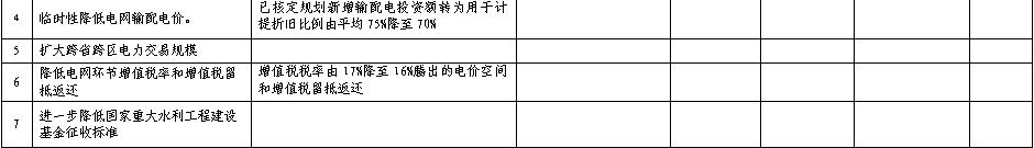 評估的降價政策措施主要包括:落實已出臺的電網(wǎng)清費政策、推進區(qū)域電網(wǎng)和跨省跨區(qū)專項輸電價格改革、進一步規(guī)范和降低電網(wǎng)環(huán)節(jié)費用、臨時性降低輸配電價、降低電網(wǎng)環(huán)節(jié)增值稅率和增值稅留抵返還、擴大跨省跨區(qū)電力交易規(guī)模、進一步降低國家重大水利工程建設(shè)基金征收標(biāo)準(zhǔn)、督促自備電廠承擔(dān)電價交叉補貼等。