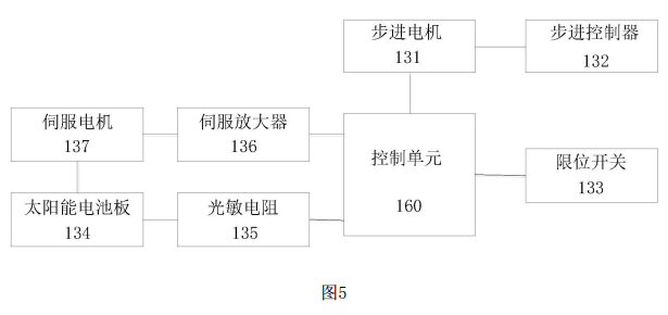 進(jìn)一步地,所述光伏發(fā)電單元還包括太陽(yáng)能電池板、光敏電阻、伺服放大器以及伺服電機(jī),所述光敏電阻設(shè)置于所述太陽(yáng)能電池板,所述伺服放大器分別與所述伺服電機(jī)和所述控制單元連接,所述伺服電機(jī)與所述太陽(yáng)能電池板連接;