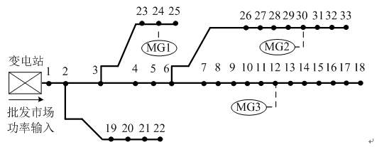 為了驗(yàn)證本文所提出的雙層優(yōu)化方法的可行性,本文以IEEE 33節(jié)點(diǎn)系統(tǒng)為例,對配電側(cè)日前電力市場交易進(jìn)行仿真模擬??紤]配電市場中包含3個(gè)微電網(wǎng),分別位于系統(tǒng)的12、24和30節(jié)點(diǎn)[23],系統(tǒng)結(jié)構(gòu)如圖4所示。