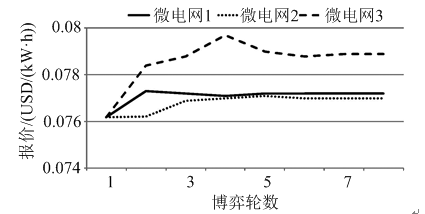 4)比較微電網(wǎng)運(yùn)營商前后兩次的報(bào)價(jià)是否發(fā)生改變,若存在任一運(yùn)營商的報(bào)價(jià)改變,則返回步驟2),直至所有運(yùn)營商都不再改變報(bào)價(jià)。