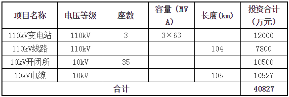 渭沱拓展區(qū)遠(yuǎn)期投資估算總計(jì)4.08億元。新建110kV變電站3座,投資1.2億元;新建110kV架空線路104公里,投資0.78億元;新建10kV開(kāi)閉所35座,投資1.05億元;新建10kV電纜線路105公里,投資1.05億元。