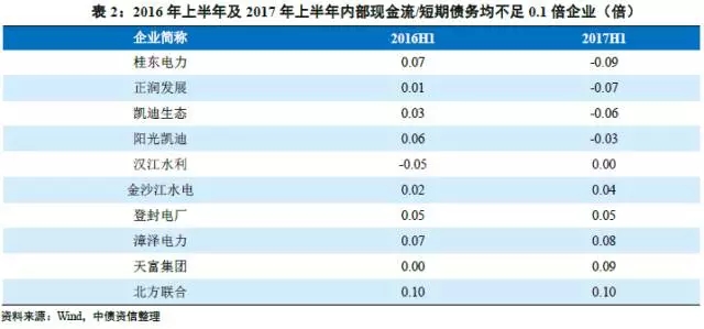 短期償債指標(biāo)方面,2017年6月末樣本企業(yè)現(xiàn)金類資產(chǎn)/短期債務(wù)為0.30倍,較去年同期(0.30倍)變化不大??紤]到電力行業(yè)涉及國計民生,外部支持力度較大,整體融資環(huán)境較好,短期償債表現(xiàn)仍較好。根據(jù)樣本數(shù)據(jù),2017年上半年內(nèi)部現(xiàn)金流/短期債務(wù)不足0.5倍的企業(yè)共49家(占樣本企業(yè)總數(shù)的90.74%),同比增長7家。此外,41家企業(yè)內(nèi)部現(xiàn)金流/短期債務(wù)有所下降(占樣本企業(yè)總數(shù)的75.93%)。