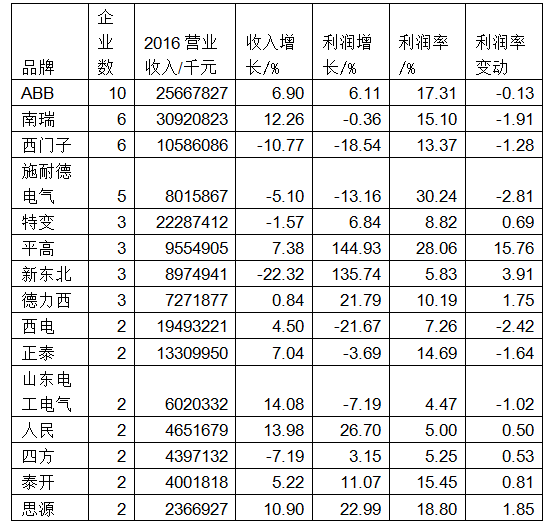 南瑞的6家企業(yè)以309億元營收領跑所有品牌,ABB的10家企業(yè)以257億元營收居次,特變的3家企業(yè)以223億元營收第三。西電、正泰、西門子幾大品牌的營收也超過100億元。